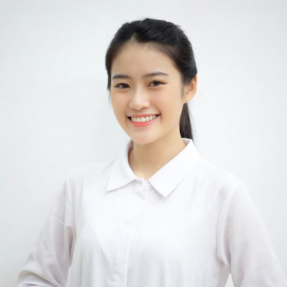 A young Asian woman with black hair tied in a ponytail smiles warmly at the camera. She wears a crisp white collared shirt and stands against a plain white background. Her expression is friendly and approachable.