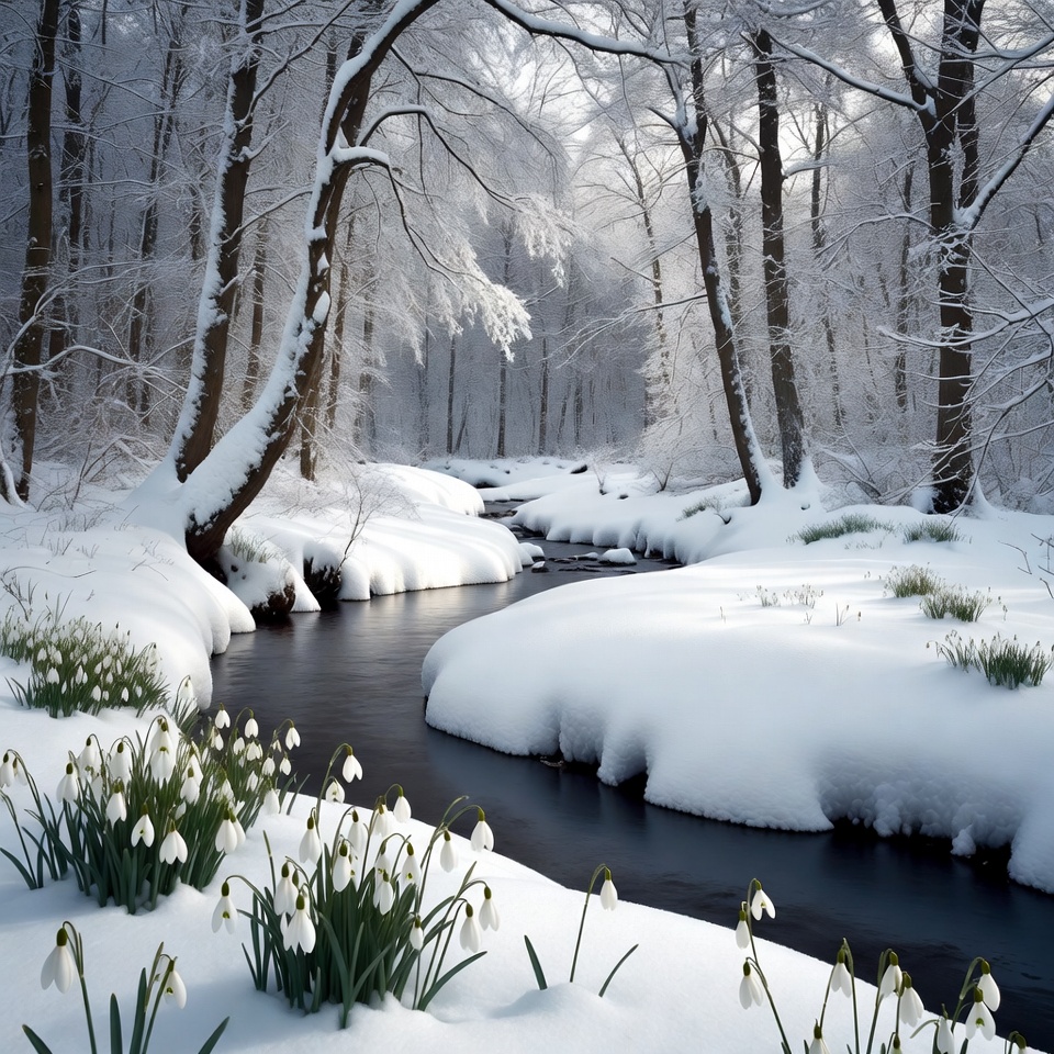 A serene winter forest features a gently curving stream lined with heavy snow. Snow-covered trees arch over the water, and clusters of delicate white snowdrop flowers bloom along the snowy banks. Sunlight filters through the branches, illuminating the pristine landscape.