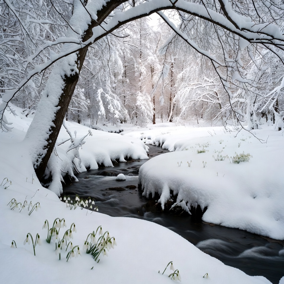 A serene winter landscape features a snow-covered forest with dense trees arching over a gently flowing stream. Fresh snow blankets the ground and branches, with small green snowdrops emerging near the water's edge. Sunlight filters through the trees, illuminating the pristine white scenery.