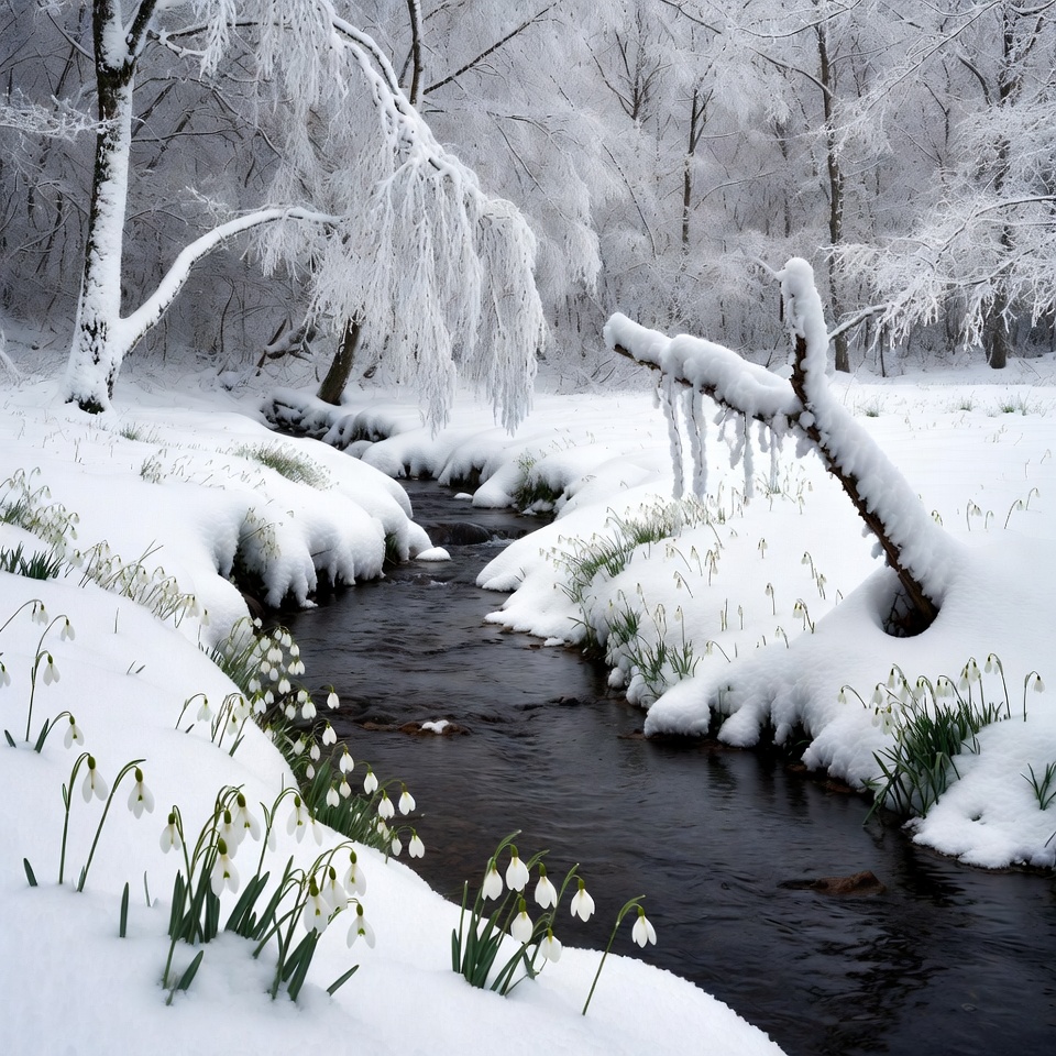 A serene winter landscape features a gently flowing stream bordered by heavy snow. Delicate white snowdrop flowers bloom along the snowy banks amidst frost-covered trees and branches. Icicles hang from overhanging limbs in the pristine snowfield.