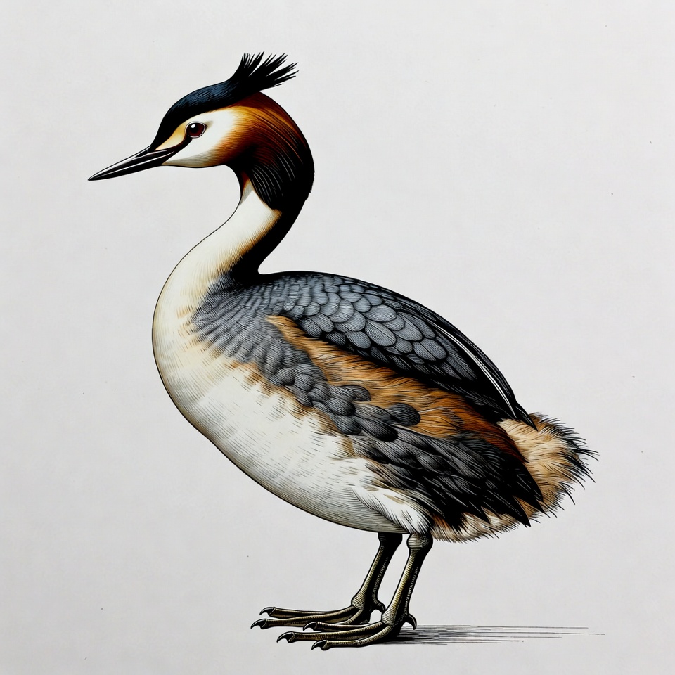 aquatic bird, bird illustration, bird portrait, black crest, crested grebe, feathers, gray feathers, grebe bird, isolated background, long bill, orange wings, side view, standing bird, water bird, webbed feet, white neck, wildlife art, great crested grebe