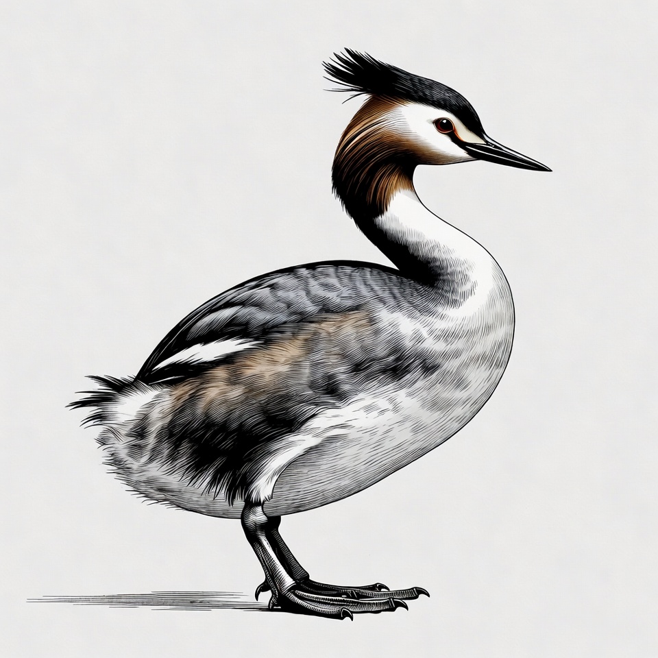 bird, black crest, brown feathers, crest, crested grebe, detailed drawing, feathers, grebe, grey body, illustration, isolated background, sharp beak, standing bird, water bird, webbed feet, white neck, wildlife, great crested grebe
