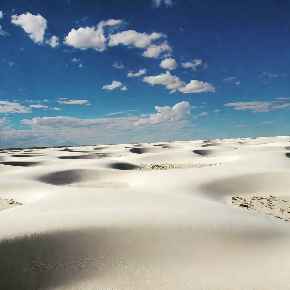 Vast white sand dunes stretch across a desert landscape under a clear blue sky with scattered white clouds. The smooth, curved dunes create rolling hills in the foreground. Distant flat horizon contrasts with the bright sky.