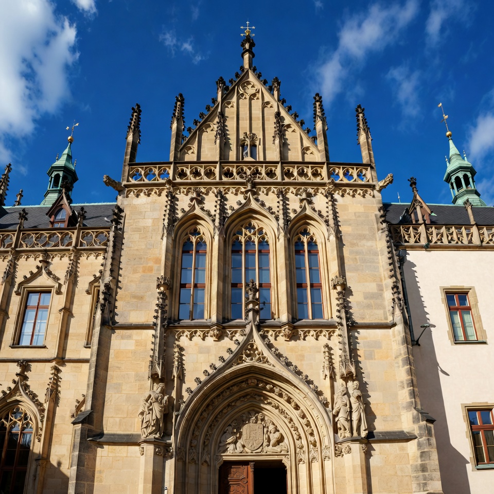 European castle, arches, blue sky, buttresses, castle, clouds, entrance, facade, gargoyles, green domes, historic architecture, landmark, medieval building, ornate carvings, pinnacles, pointed arches, ribbed vaulting, sandstone, sculptures, spires, stained glass windows, stone building, towers, wooden door, Gothic architecture