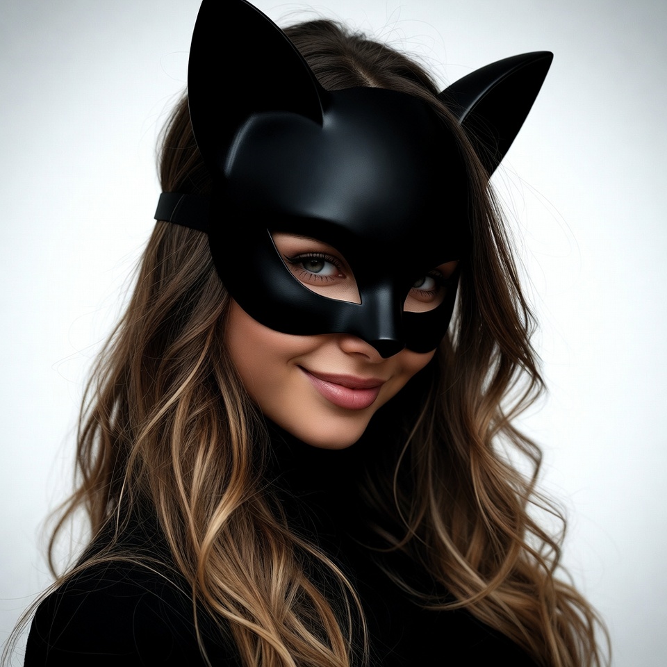 A young woman with long wavy brown hair wears a shiny black cat mask with pointed ears over her eyes and nose. She smiles playfully with pink lips visible below the mask and gazes at the camera. She has on a black top and stands against a plain white background.