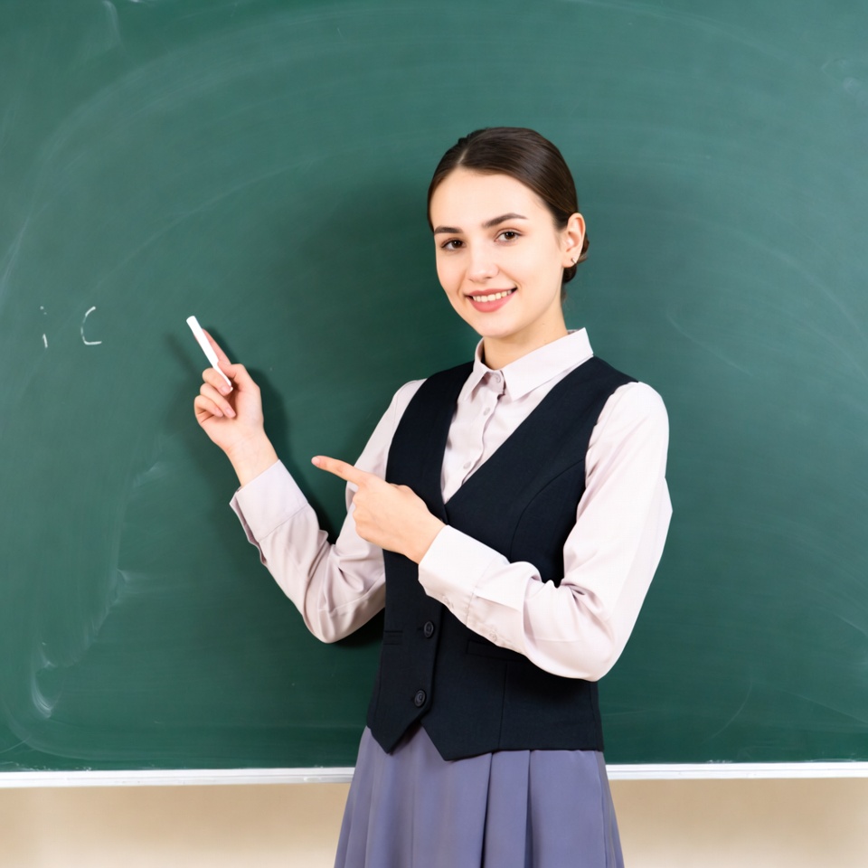 White, chalk, chalkboard, classroom, dark hair, education, female, formal attire, green board, pointing, pointing finger, school, skirt, smiling, standing, teaching, vest, white shirt, woman, teacher