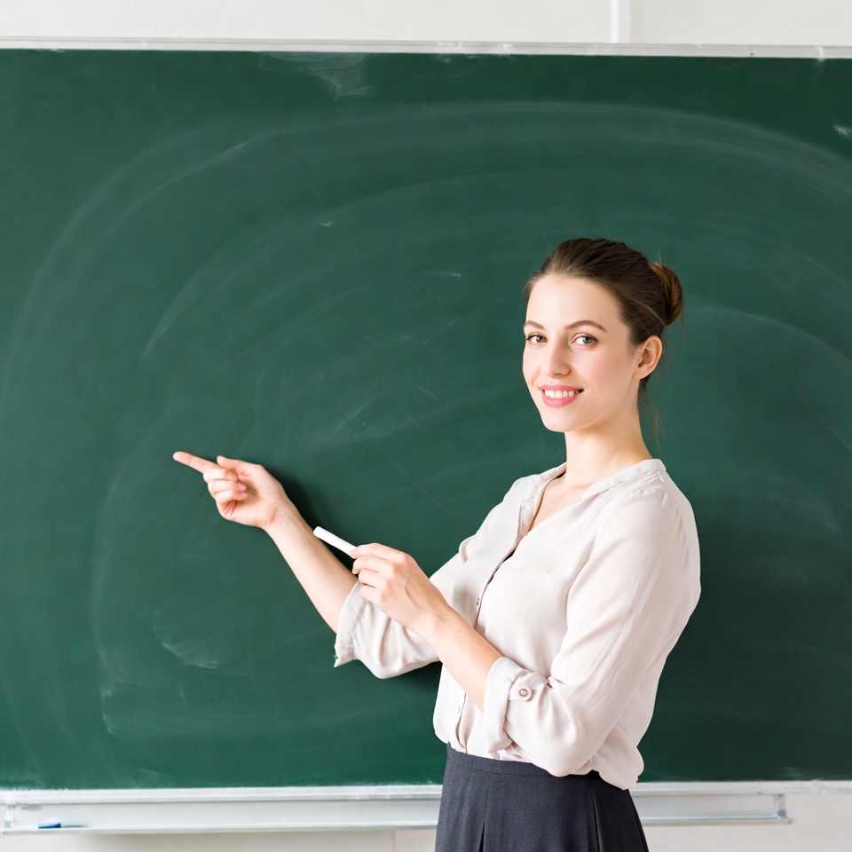 A smiling woman with brown hair in a bun stands in front of a large green chalkboard in a classroom. She wears a light blouse and dark skirt while pointing at the board with one hand and holding a piece of chalk in the other. The chalkboard has chalk marks and a circular drawing.