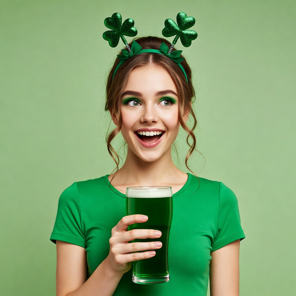 A young woman with curly brown hair and green shamrock headband smiles excitedly on a green background. She wears a green t-shirt and holds a tall glass of green beer. Her makeup features bold green eyeshadow.