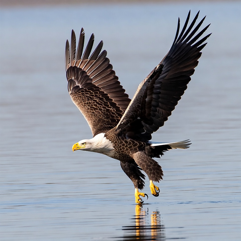 animal, avian, bird, blue water, eagle, feathers, flying, nature, outdoors, predator, raptor, reflection, soaring, water, white head, wildlife, wings spread, yellow beak, bald eagle