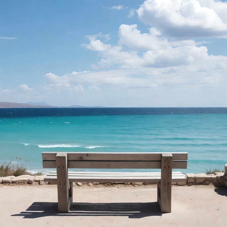 beach, blue sky, clouds, coast, dry grass, empty bench, horizon, landscape, mediterranean sea, nature, ocean, outdoors, peaceful view, sea, seaside, shadow, stone ledge, turquoise water, vacation spot, wooden bench