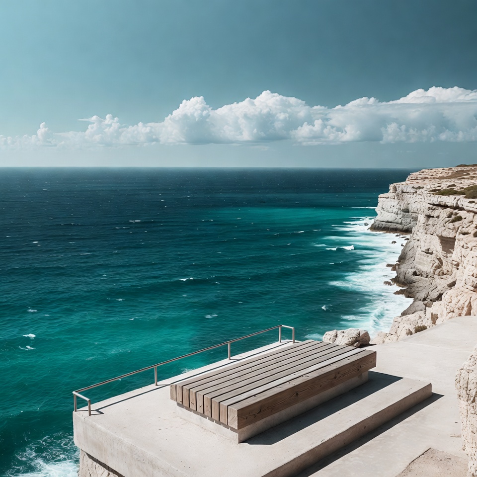 bench, blue sky, cliff, coastline, concrete platform, isolated background, landscape, metal railing, nature, ocean, outdoor, rocky cliff, scenic view, sea, seascape, turquoise water, waves, white clouds, wooden bench