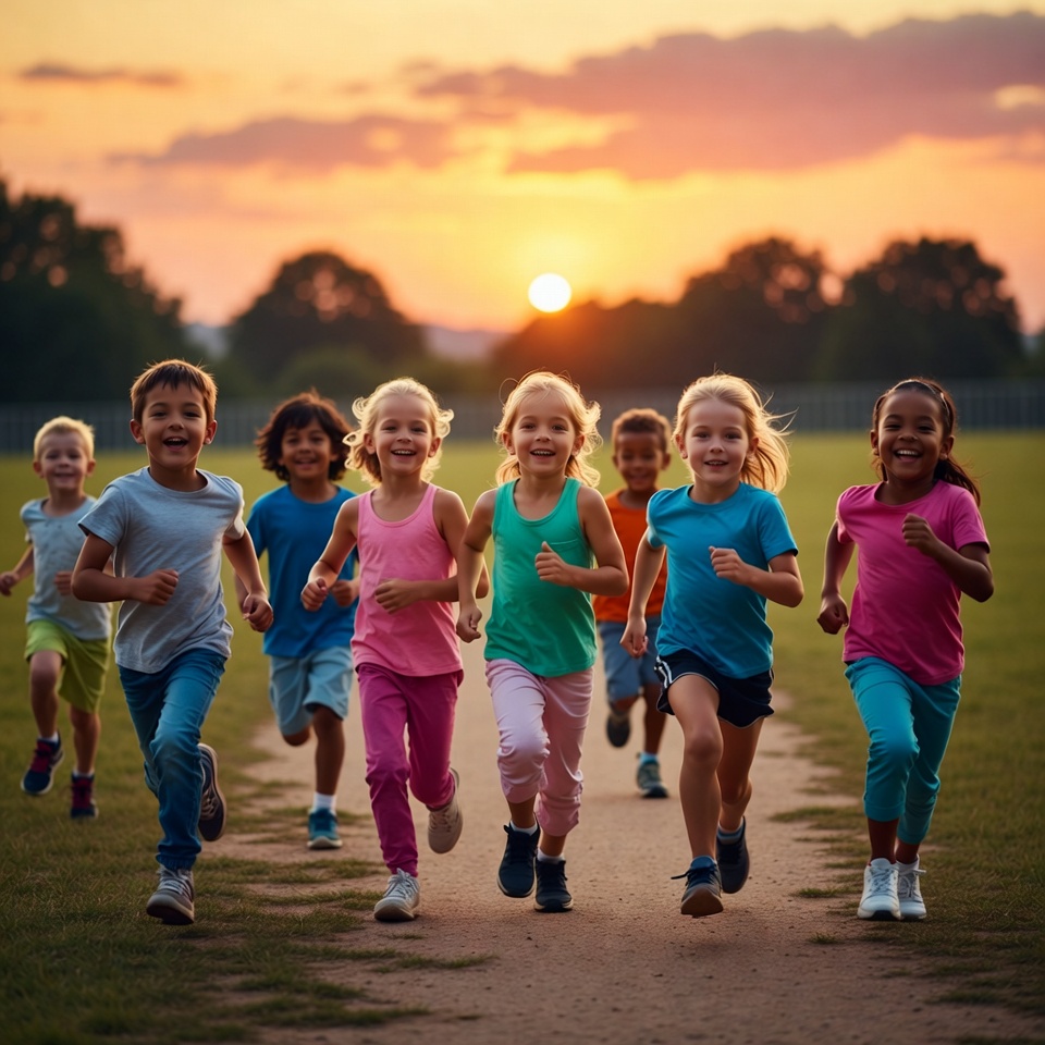 A group of diverse young children runs along a dirt path on a grassy field during sunset. They wear colorful athletic clothes like t-shirts and shorts in shades of blue, pink, green, and orange. The vibrant orange sun glows behind them with trees in the background.