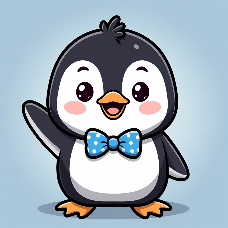 A chibi-style cartoon penguin with black and white feathers waves happily with one flipper raised. It wears a blue polka-dot bowtie and has large sparkling eyes, rosy cheeks, and a big smile. The illustration is set against a light blue isolated background.