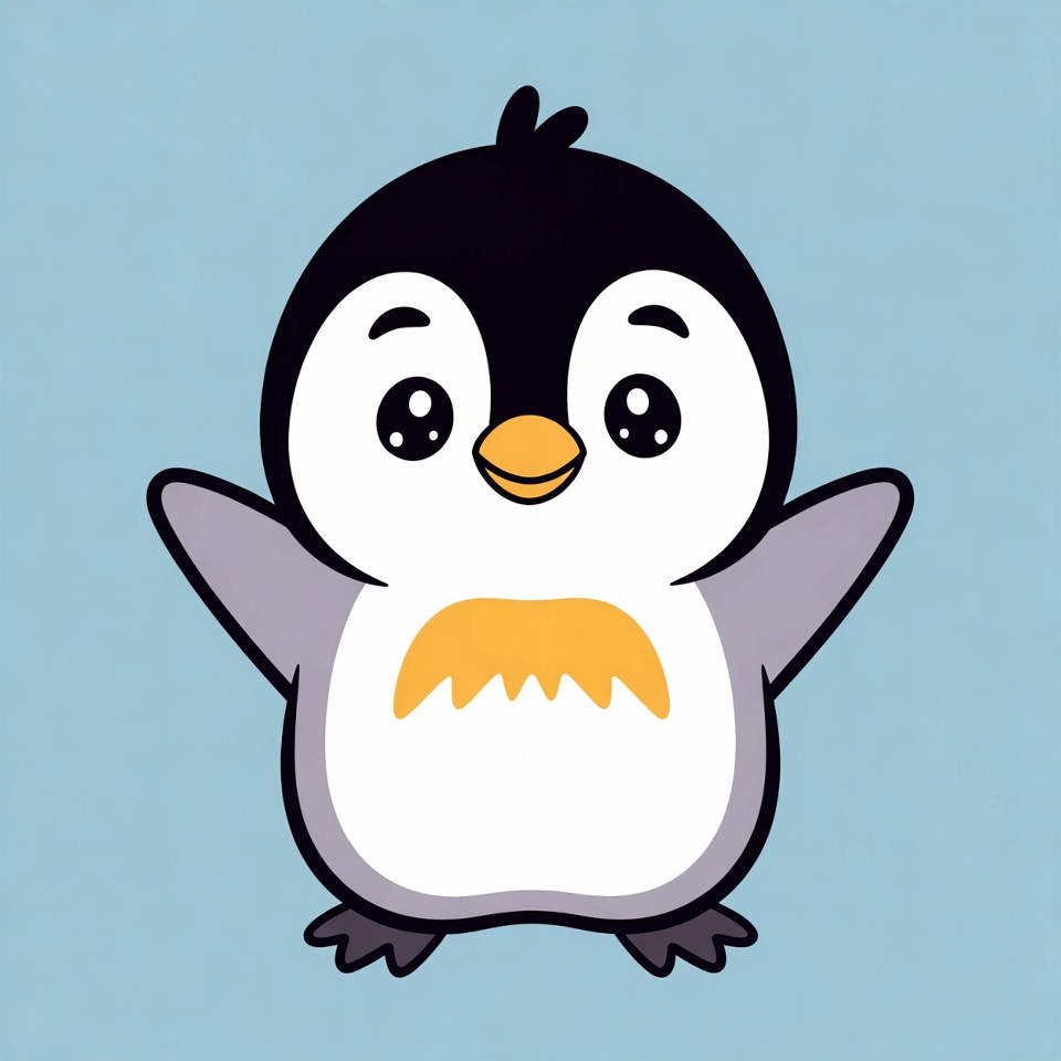 A kawaii-style cartoon penguin stands on a light blue background with wings outstretched. It has black head feathers, white belly, orange beak and feet, and a small orange tuft under the beak. The penguin features large expressive eyes and a cheerful smile.