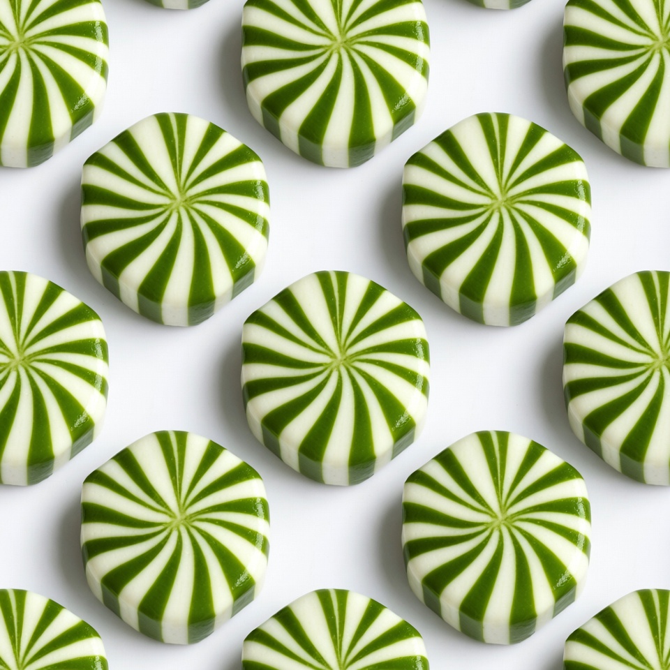 A close-up pattern of numerous hexagon-shaped candies with green and white swirled designs on a white background. Each candy features a hypnotic spiral pattern in vibrant green and crisp white. The candies are arranged in a tight grid, isolated for a clean, repeating texture.