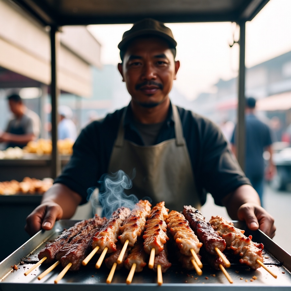 Asian cuisine, Southeast Asian, apron, barbecue, busy market, cap, food cart, food stall, fresh grill, grilled meat, grilled skewers, hawker, hawker stall, meat skewers, metal tray, outdoor market, savory skewers, skewer tray, skewers, smiling vendor, smoke, street food, street market, street vendor, tray, vendor, vendor smiling, Asian man