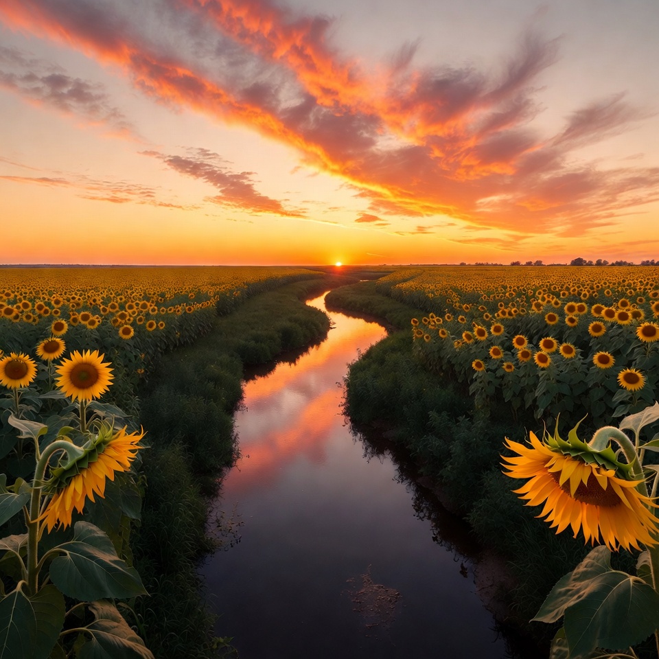 Sunflower Field with Winding Stream at Sunset