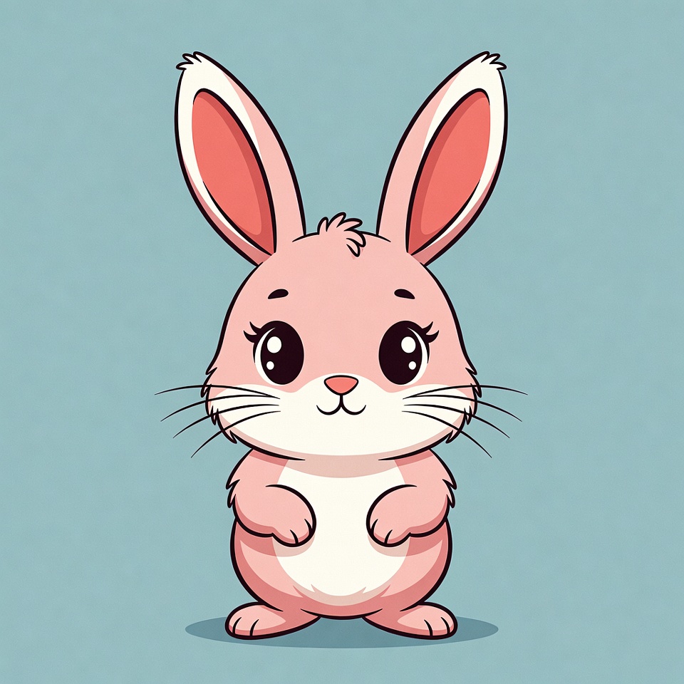 A cute cartoon pink bunny stands on a light blue background. It has large pink ears, big sparkling eyes, and fluffy white fur on its belly and paws. The bunny smiles happily with a simple, isolated design.