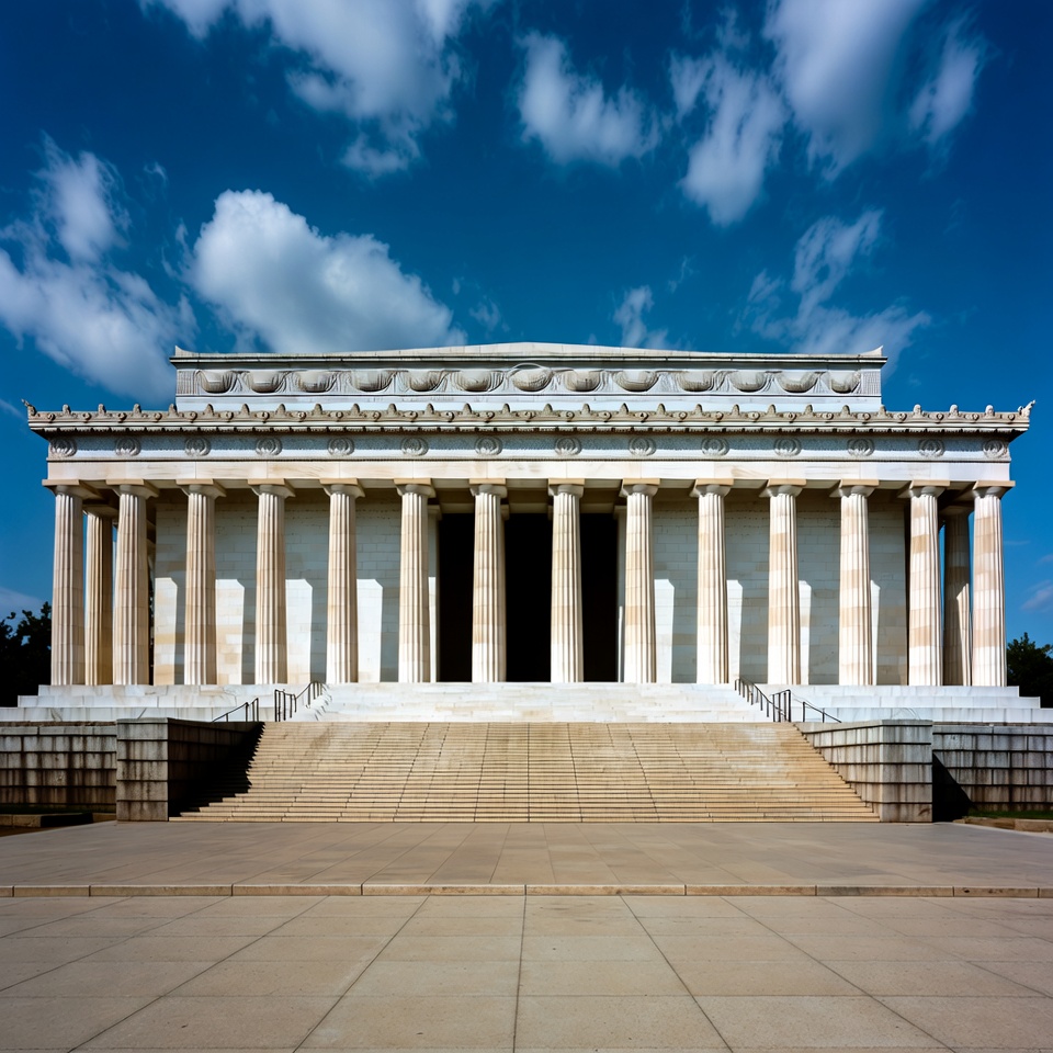 Greek style, Washington DC, architecture, blue sky, capitol, clouds, columns, entrance, historical site, iconic, landmark, marble, memorial, monument, national monument, neoclassical, outdoors, pediment, plaza, steps, tourism, travel, white building, Lincoln Memorial