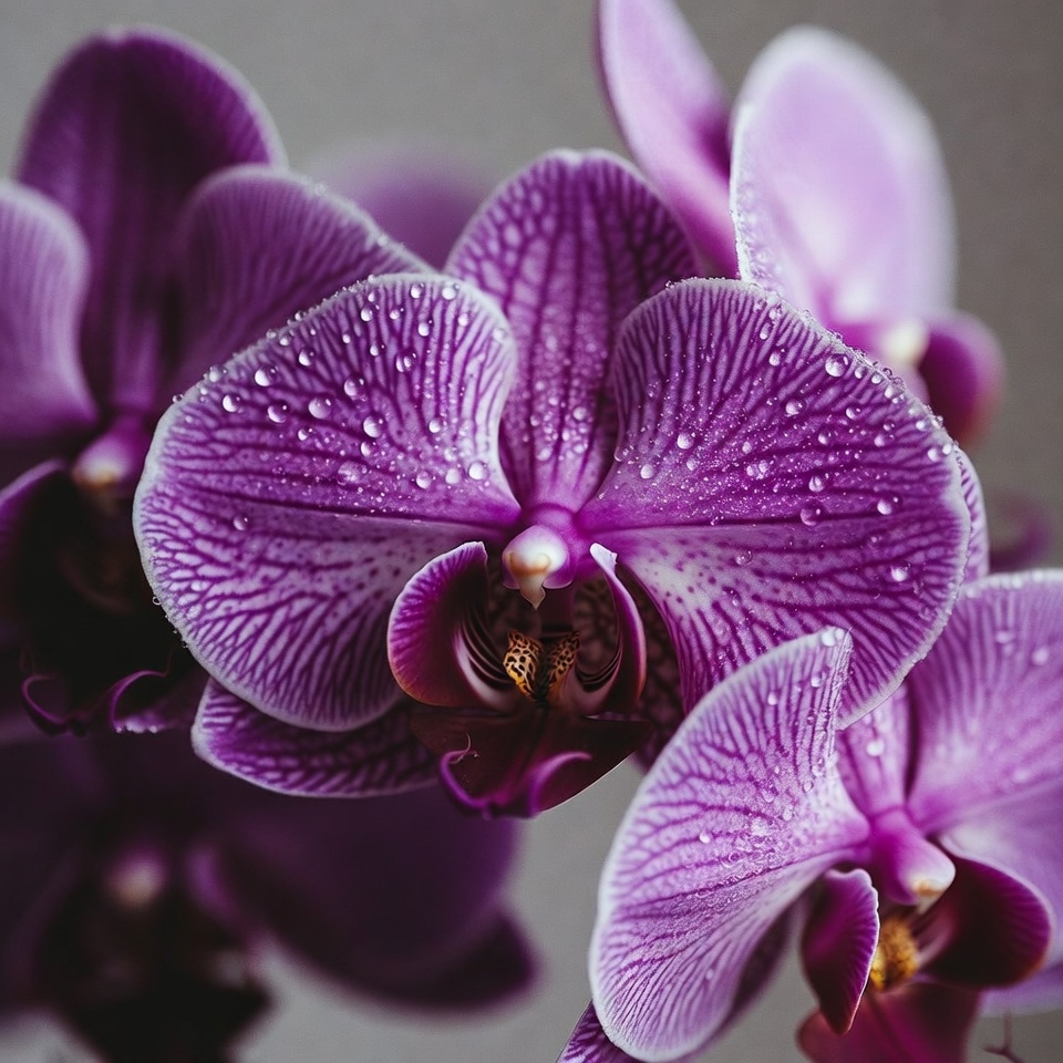 Close-up of vibrant purple orchid flowers with intricate veined petals covered in water droplets. The blooms feature striking magenta centers and are set against a soft gray background. Multiple orchids cluster together, showcasing their elegant shapes and glossy surfaces.