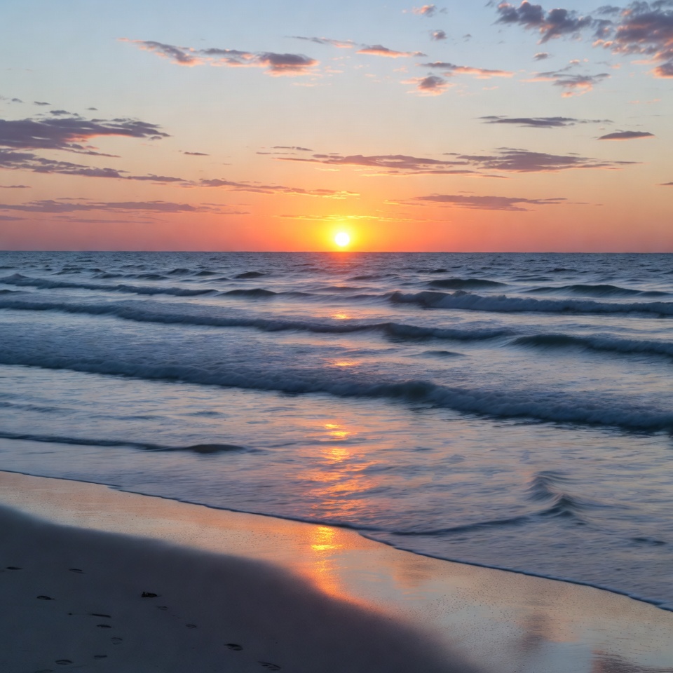 A vibrant sunset illuminates the sky with orange, pink, and purple hues above a calm ocean. Gentle waves roll towards a sandy beach in the foreground, reflecting the sun's golden light. Scattered clouds enhance the dramatic seascape.