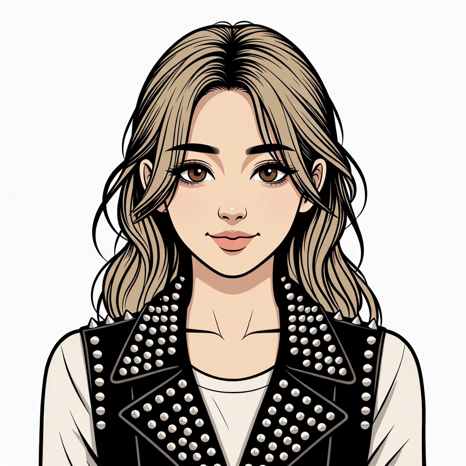 Asian, anime girl, blonde hair, brown eyes, cartoon, clipart, fashion, illustration, isolated background, leather vest, portrait, rocker style, silver spikes, studded jacket, studs, wavy hair, white top, young woman, woman