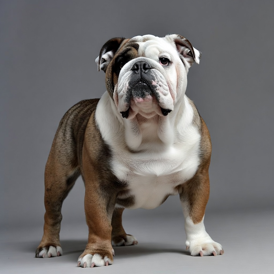 A cute English Bulldog stands on a plain gray background. The dog has a white and brown brindle coat, wrinkled face, and expressive eyes. It faces forward with paws planted firmly.