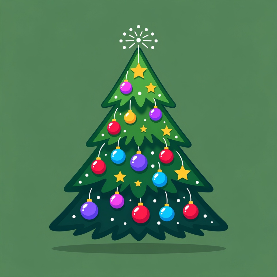 A vibrant green Christmas tree illustration stands on a solid green background. It is decorated with multicolored ornaments including red, blue, purple, and yellow balls, along with golden stars. A sparkling star tops the tree.
