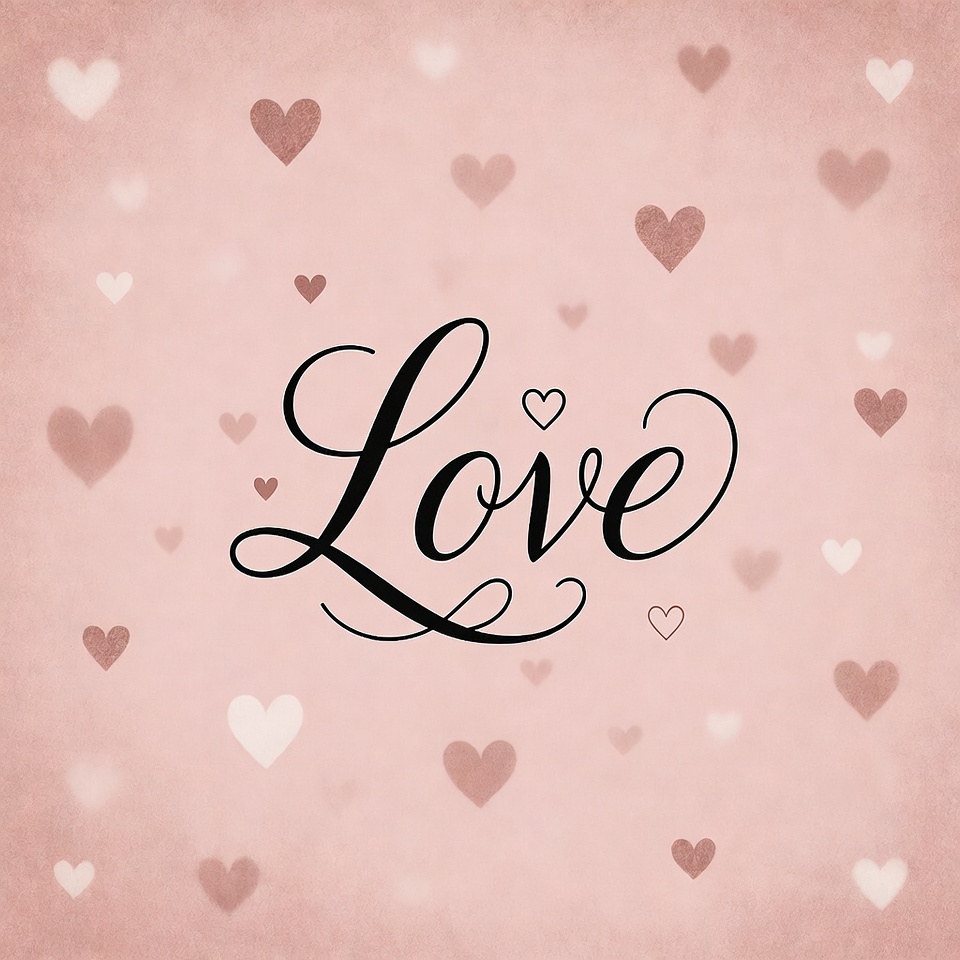 Elegant black cursive 'Love' text is centered on a textured pink background. Surrounding the text are numerous scattered pink and white heart shapes in a bokeh style. The design features a soft, romantic aesthetic with subtle glow effects.