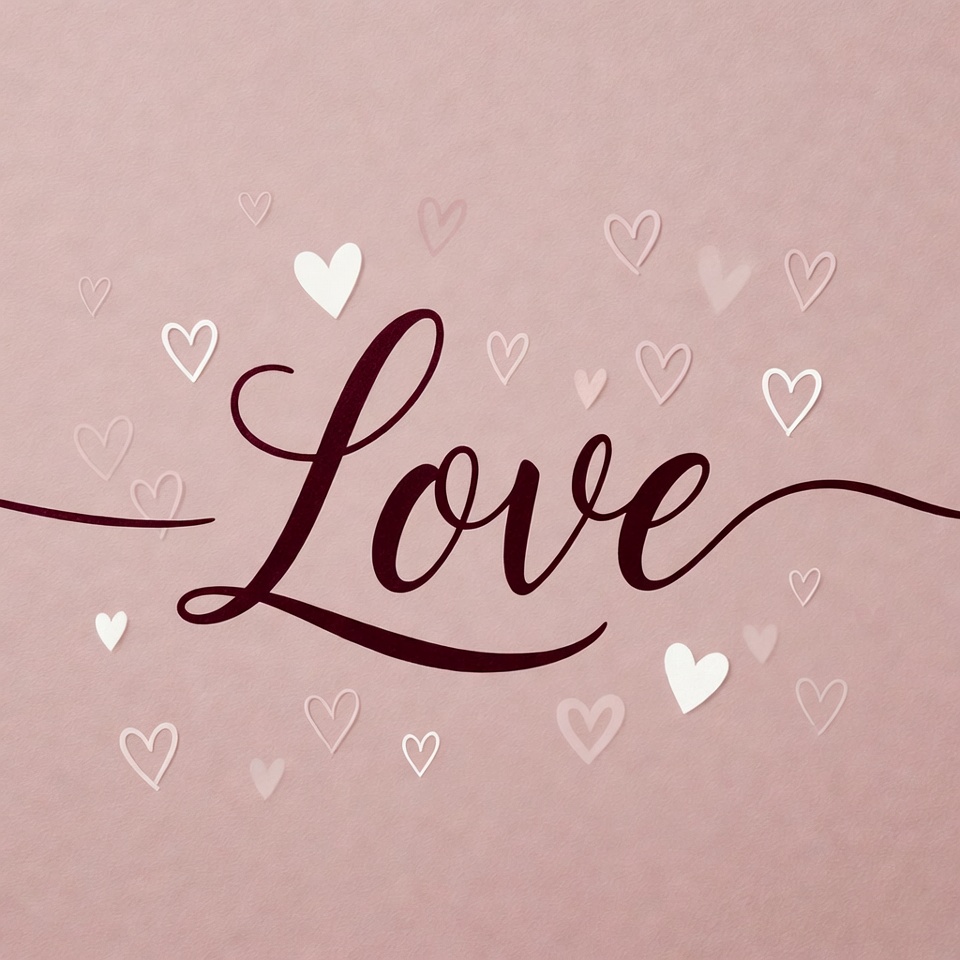 cursive font, elegant lettering, graphic design, hearts, illustration, pink background, pink hearts, red lines, romantic, scattered hearts, soft pink, text, valentine, white hearts, love