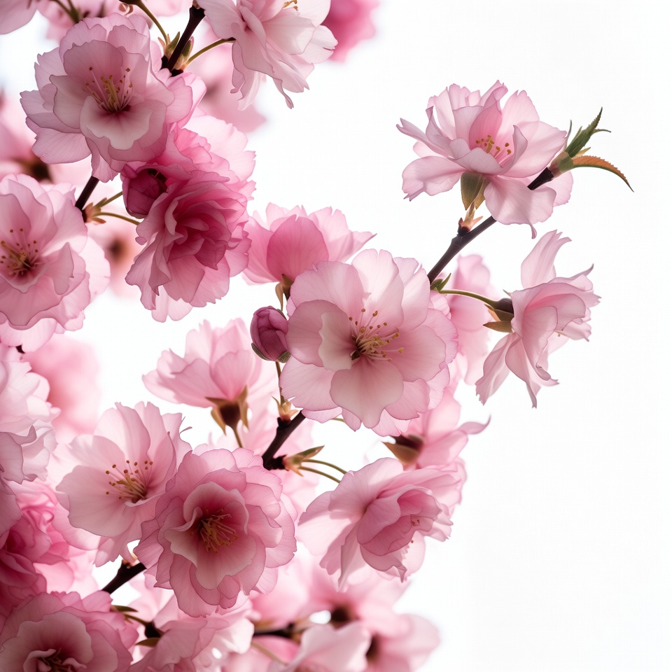 Delicate pink cherry blossom flowers bloom on thin branches against a plain white background. The petals are soft and layered, with green buds emerging nearby. The image captures the intricate details of the blossoms in close-up.