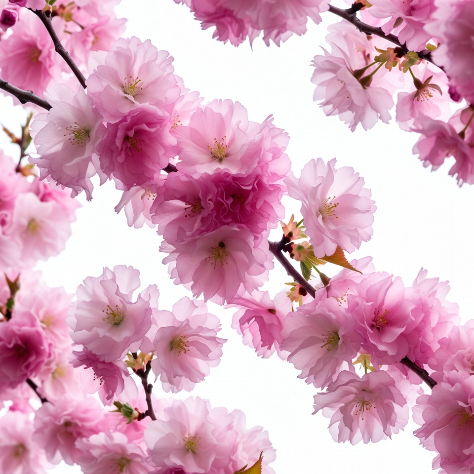 Delicate pink cherry blossom flowers bloom on thin branches against a white background. The petals are soft and layered, with green leaves and buds visible among the clusters. The arrangement creates a beautiful, isolated floral pattern.