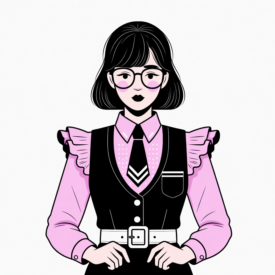 Asian, bangs, black hair, black vest, bob haircut, clipart, fashion, female, glasses, hands on hips, illustration, isolated background, pink shirt, pink tie, ruffle shoulders, stylish, vector art, white belt, woman