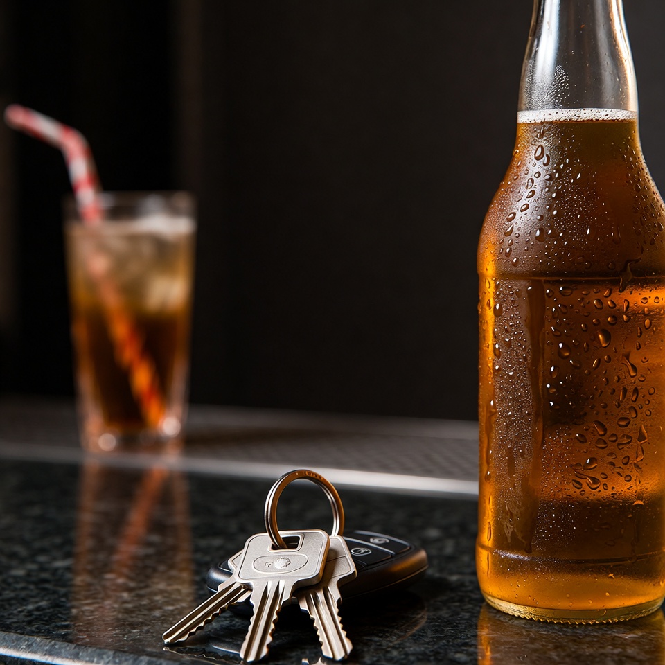A cold beer bottle with condensation stands on a dark bar counter next to a set of car keys. A glass of iced tea with a red straw sits beside them. The items are arranged against a blurred dark background.