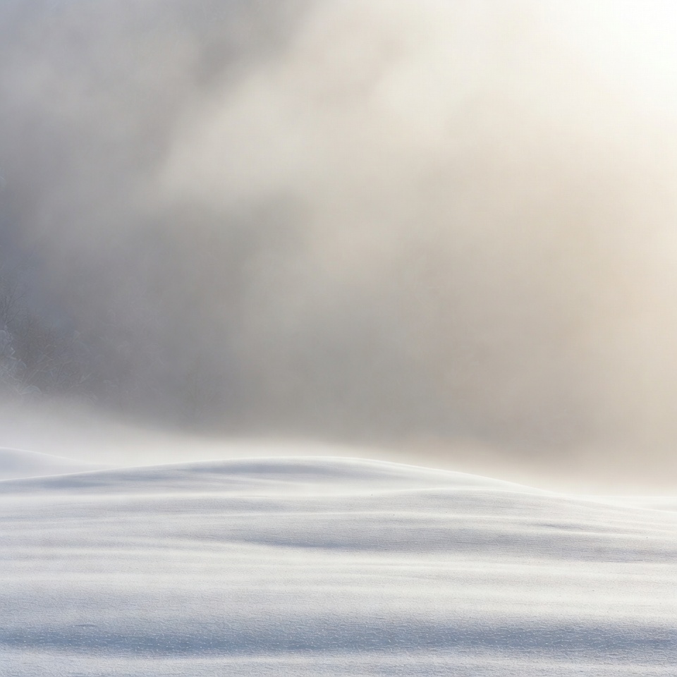 A serene winter landscape features smooth, rolling snow-covered hills under a foggy sky. Thick mist swirls above the snow, creating a soft, ethereal atmosphere. Gentle sunlight filters through the haze, illuminating the pristine white terrain.