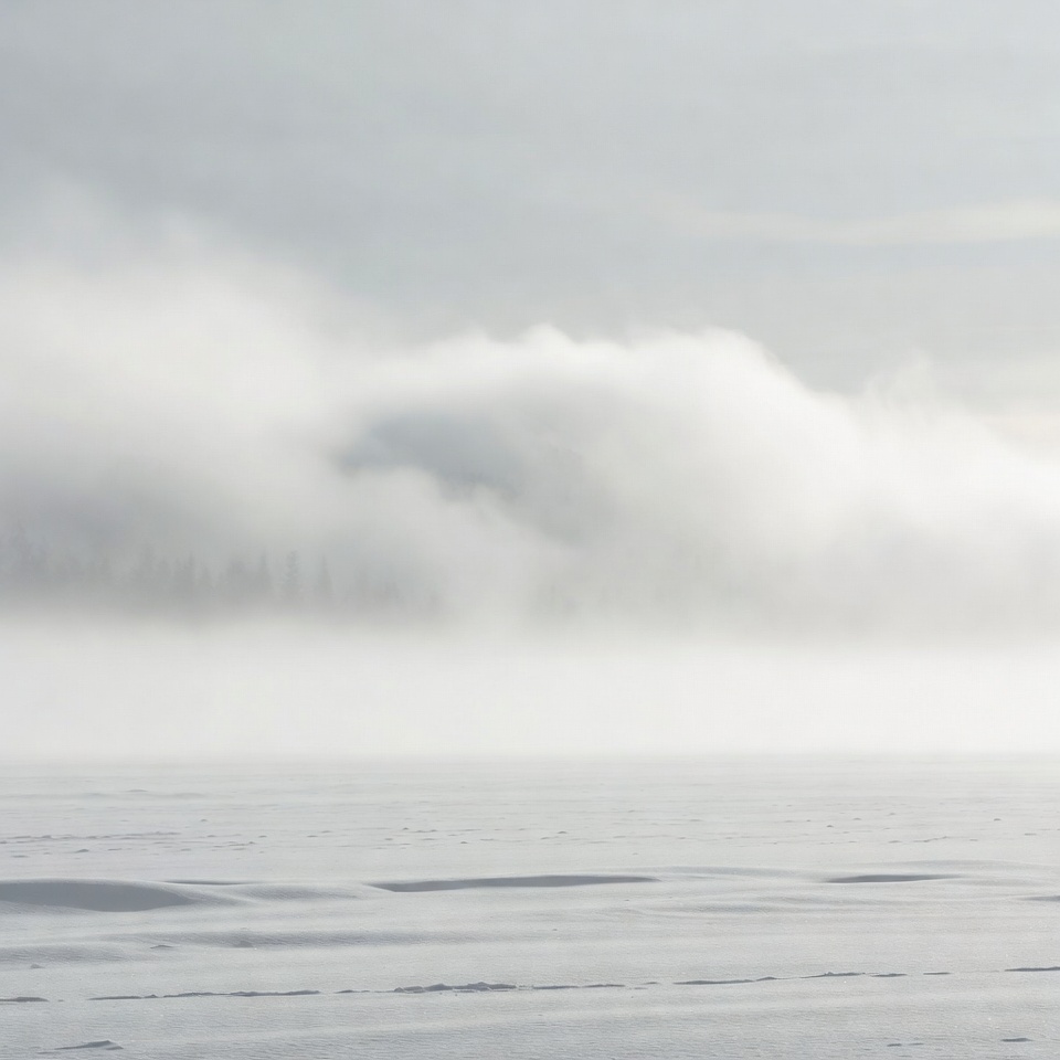 atmospheric, blurred, clouds, cold, distant trees, expansive, foggy, frosty, frozen, gray, hazy, icy plain, landscape, low clouds, mist, nature, outdoors, overcast, pine trees, serene, snow, snowy field, trees, weather, white, winter, fog