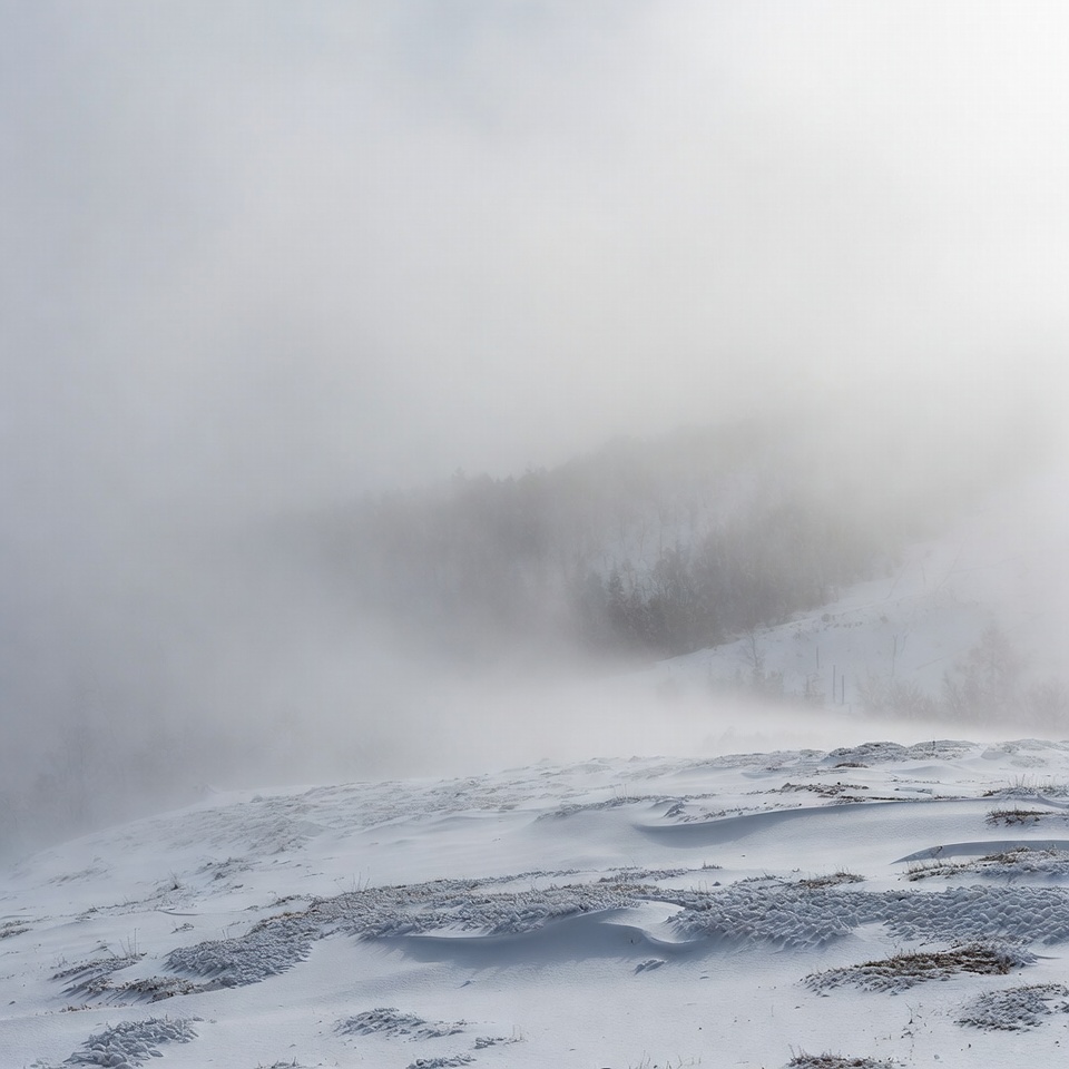 A vast snowy landscape features rolling hills covered in thick snow and patches of vegetation. Dense fog envelops distant pine trees and mountains, creating a misty horizon. Soft light filters through the heavy clouds above.
