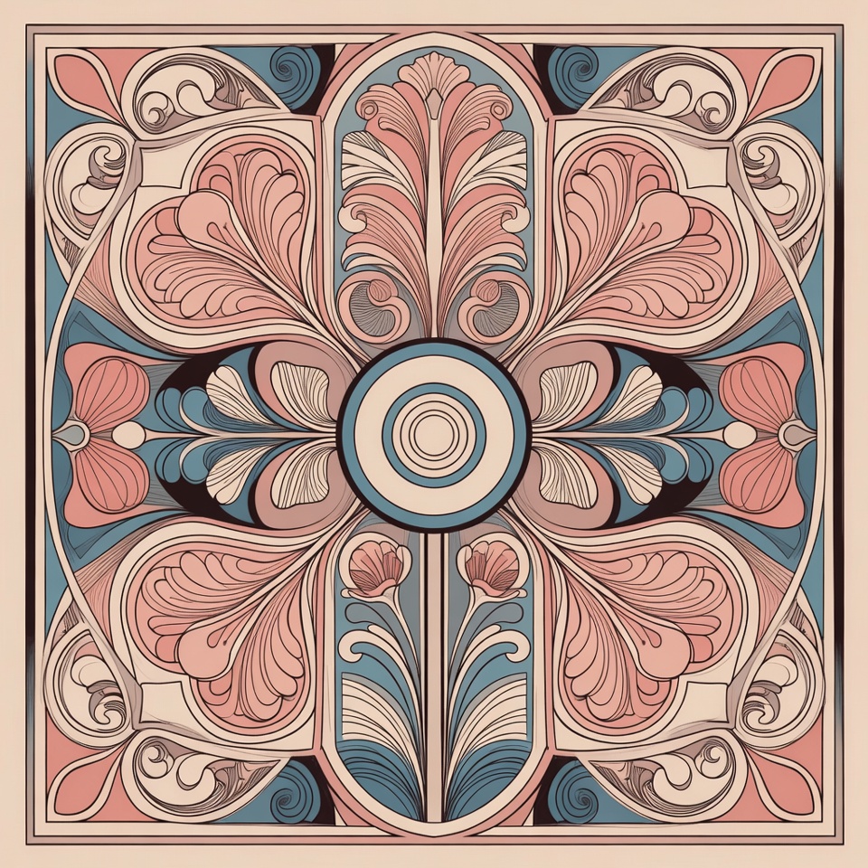 A symmetrical Art Nouveau illustration features intricate floral motifs in pink, teal, and cream tones. Central circular element surrounded by fan-like leaves, petals, and swirling decorative borders. Square composition with ornate, elegant line work on isolated background.