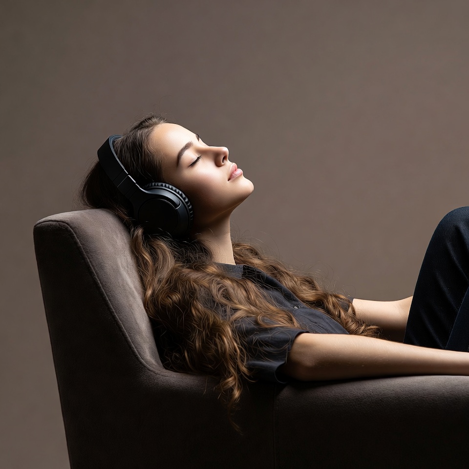 A young woman with long curly hair reclines on a brown armchair, wearing black over-ear headphones and a black t-shirt with jeans. Her eyes are closed and mouth slightly open in a relaxed expression. She lies back against the chair with arms extended on a neutral brown background.