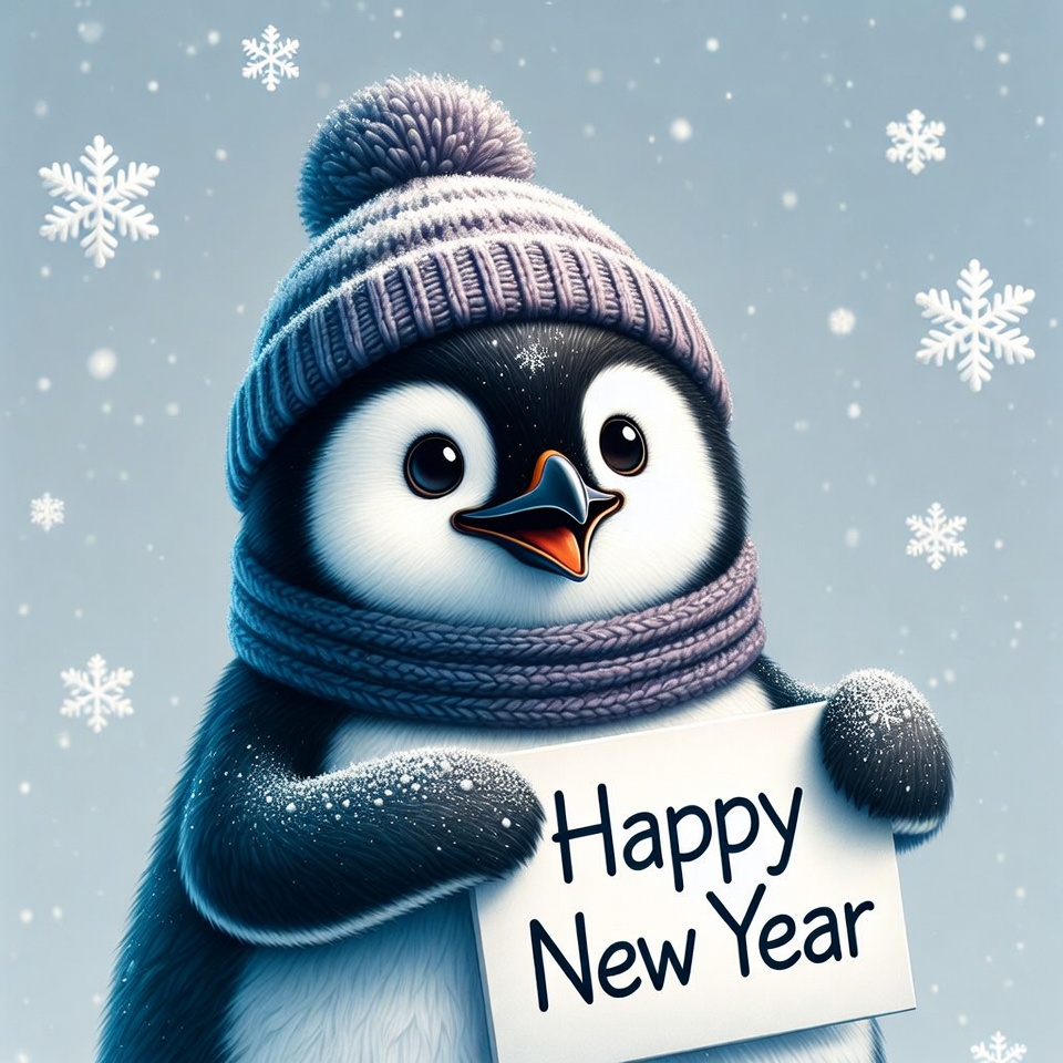 Penguin holding Happy New Year sign