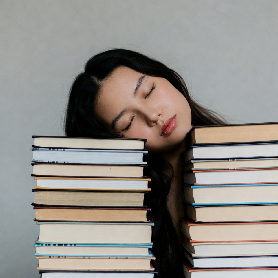 A young Asian woman with long black hair rests her head on a tall stack of books, appearing asleep with her eyes closed. She leans against the books from the side on a plain gray background. The books are various sizes with white, beige, and brown covers.