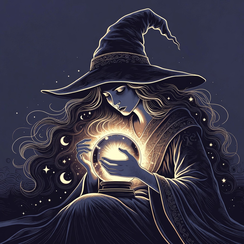 A detailed illustration of a woman dressed as a witch with a tall black pointed hat and flowing dark robe holds a glowing crystal ball between her hands. Her long wavy hair cascades around her serene face, illuminated by the radiant light from the orb. Stars and a crescent moon float in the dark mystical background.
