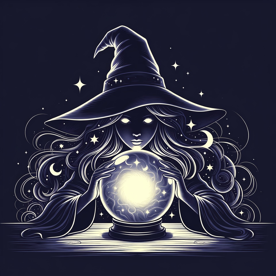 An illustration of a witch with long flowing hair and a pointed hat holds a glowing crystal ball in her hands. She has a mysterious expression with glowing eyes and is surrounded by stars and moons on a dark background. The scene is rendered in a white line art style on a wooden surface.