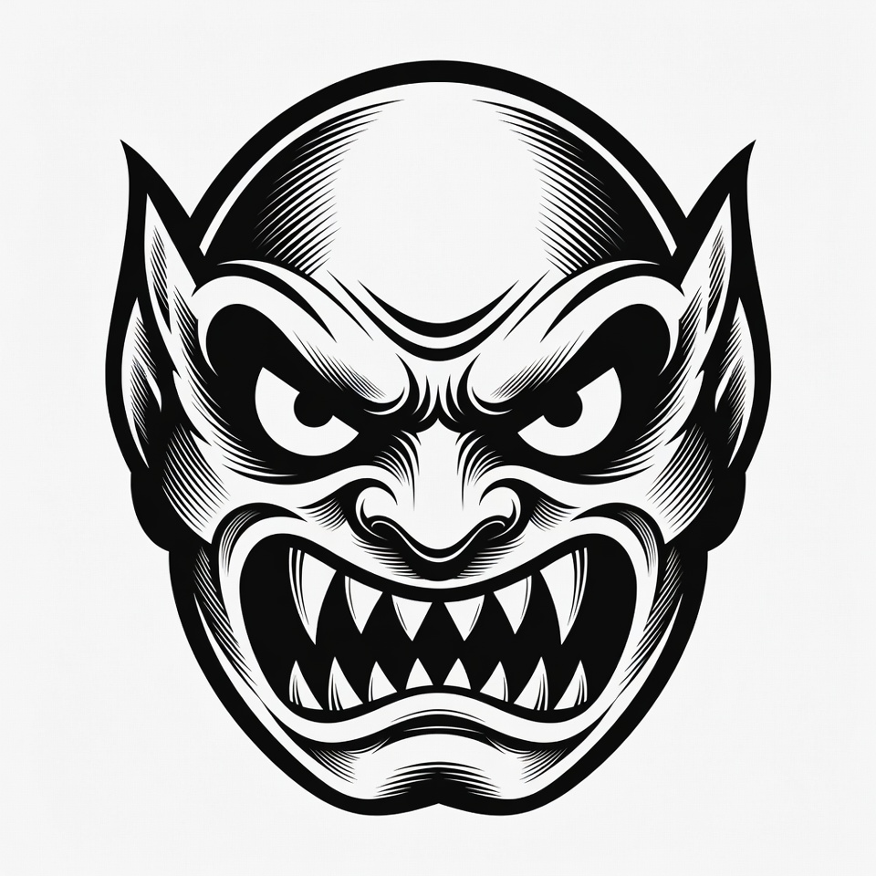 angry demon, black and white, cartoon demon, clipart, demon illustration, devil illustration, evil face, fangs, fierce expression, graphic design, horror illustration, isolated background, line art, monster illustration, pointed ears, snarling demon, vector art, demon face