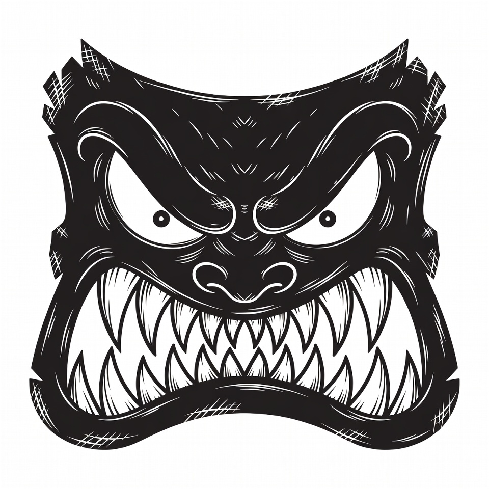 Halloween monster, angry monster, black ink, cartoon monster, clipart, demon face, fierce creature, glaring eyes, illustration, isolated background, jagged teeth, line art, scary monster, snarling face, vector art, monster face