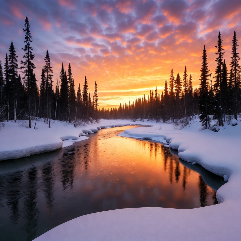 A serene river winds through a snowy landscape surrounded by dense evergreen trees under a vibrant sunset sky. The water reflects the brilliant orange, pink, and purple hues of the clouds and setting sun. Fresh snow covers the riverbanks and forest floor.