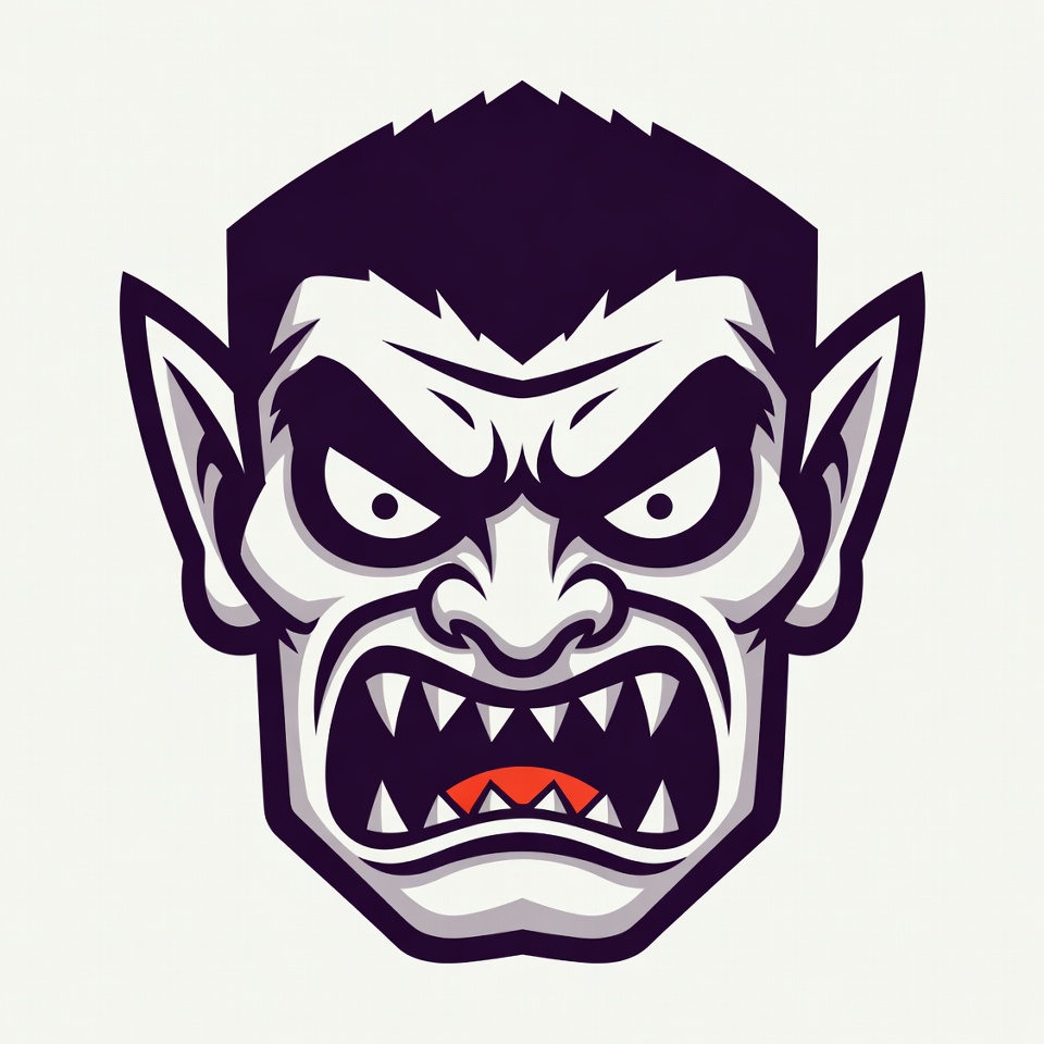 angry, bat ears, black hair, cartoon, clipart, demonic, evil, face, fangs, fierce, graphic, halloween, horror, illustration, isolated background, mascot, monster, purple accents, red mouth, snarling, vector, white skin, vampire