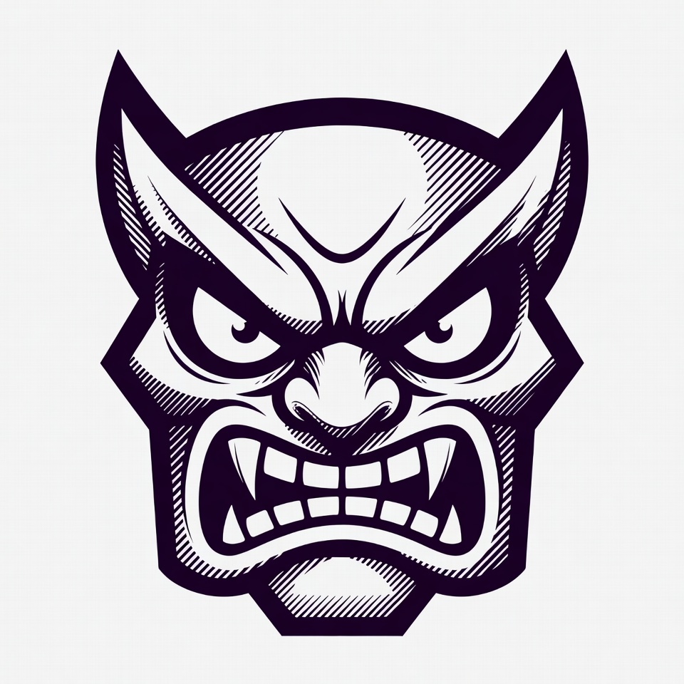 Japanese demon, angry face, black white, clipart, demon mask, fangs, fierce mask, geometric design, glaring eyes, horns, illustration, isolated background, line art, mythical creature, sharp teeth, snarling mouth, traditional mask, vector art, yokai, Oni mask