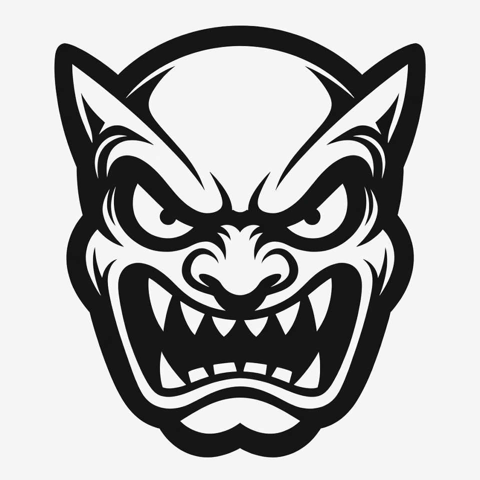 A black line art illustration depicts a fierce demon face with pointed ears, glaring eyes, snarling snout, and sharp fangs. The design features bold outlines on a white isolated background. The menacing expression emphasizes jagged teeth and furrowed brows.