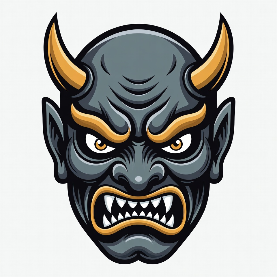 Japanese Oni, angry face, clipart, demon mask, fangs, fierce demon, glaring eyes, gray face, horror mask, illustration, isolated background, mythical creature, pointed ears, sharp teeth, vector art, yellow horns, Oni demon